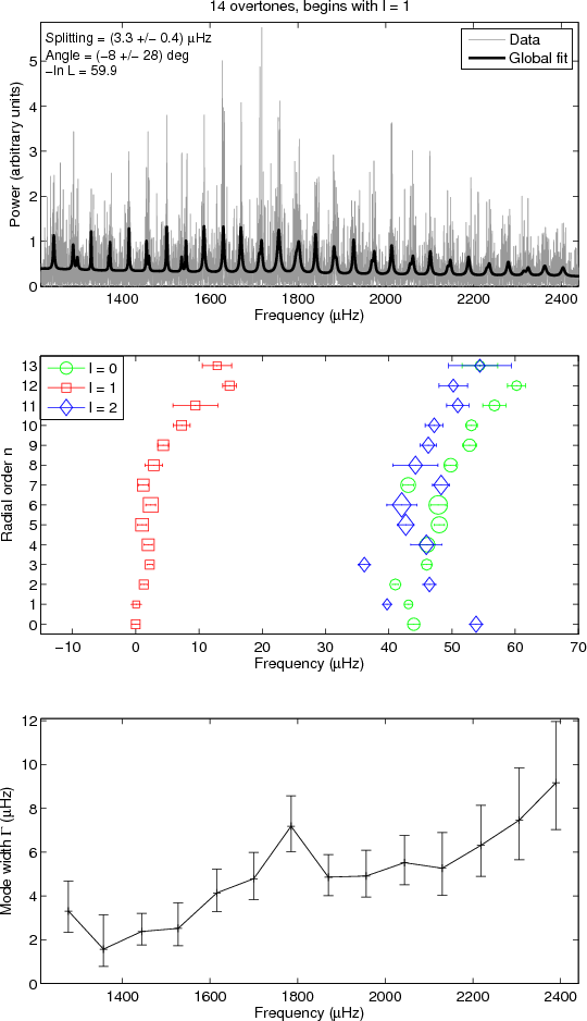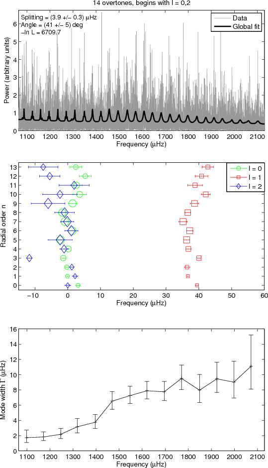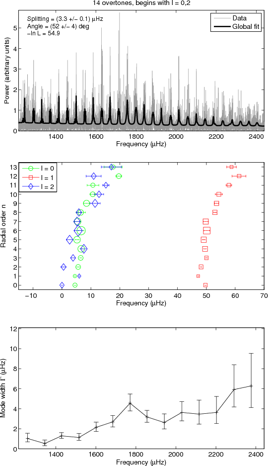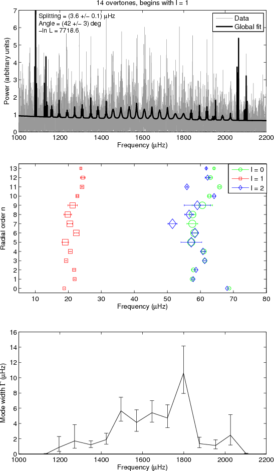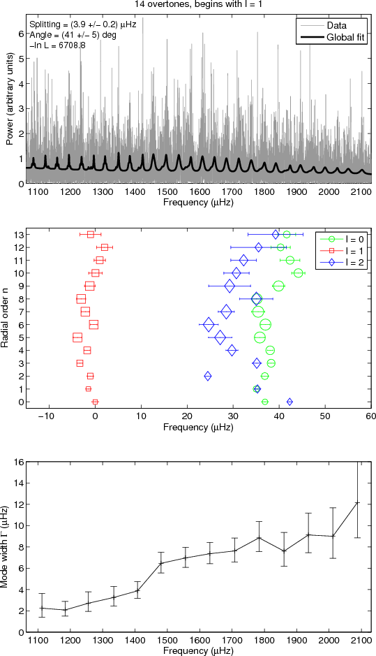 (Fig. 1) means fitting 75 parameters: 14 heights, 14 widths, 42 frequencies, a splitting, a stellar inclination, 2 stellar noise parameters (1 noise profile with a slope fixed at 2).