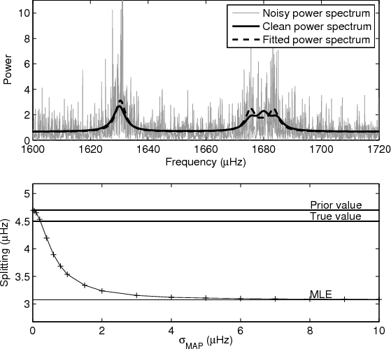 with SNR = 3, which corresponds to the maximum SNR of HD 181420 (B09). We have tested the MAP fitting procedure by using a set of priors of the same value but with linearly increasing variance. The only free parameter that we have kept is the splitting frequency. Figure 2 (bottom) shows the value of the estimated splitting frequency as a function of the prior variance. The ``true'' splitting corresponds to the value used to build the noisy power spectrum, while the ``prior'' splitting is the value that we think to be true and the ``MLE'' splitting is the value obtained with the MLE. When