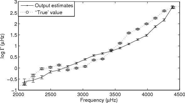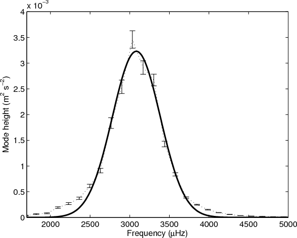 Figure 3 presents the solar mode heights as measured in 3 years of GOLF data, corresponding to a period of solar minimum activity. We have estimated the mode parameters by fitting the power spectrum with the MLE in groups of 4 overtones: 27 modes were fitted in the frequency range