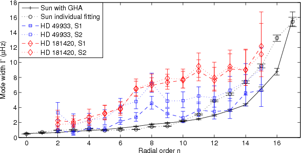 Beyond the fact that the Dirac-like convergence logically disappeared, the main result is the width trend as function of the frequency: in the 2 stars, whatever the scenario is, the mode width increases continuously. For HD 181420 the mean slope of the width on a log-log scale is equal to 2.8 in scenario 1 and 3.1 in scenario 2, while for HD 49933 the mean slope is equal to 3.2 and 2.5. These values are lower than the GOLF solar value, where the mean slope was estimated to be 4 in the central part of the oscillation spectrum. However, in Fig. 9 the widths of the two stars and the Sun are represented as functions of the radial order n, instead of the frequency, to take into account the scaling factor due to the different size and density of the 3 stars. With such a representation, the mode width frequency dependences look more similar. Note that the slight excess widths observed at the maximum power of the 2 star spectra (radial order n=8) are the probable signature of the fact that the height profile differs slightly from a perfect Gaussian trend. It is probably sharper in this frequency range.