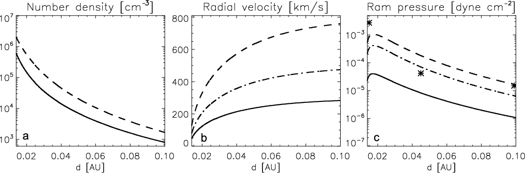c) ram pressure: stellar wind (solid line), fast CME (dashed line), average CME (dashed-dotted line). The asterisks correspond to the ion pressure modeled by Yelle (2004) at 2.3