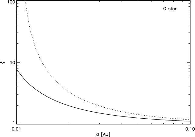 Thus, from the study of Khodachenko et al. (2007), we know that ion pick-up loss is negligible for ``Hot Jupiters'' if a planetary obstacle builds up at total atmospheric pressures 10-4 dyn cm-2 (shadowed area in Fig. 5). To compare the stellar wind and CME ram pressure with the ionospheric pressure of ``Hot Jupiters'', one has to know the stellar wind and CME plasma density and velocity as a function of orbital distance, as well as the ionospheric density profile, and the ion temperature and electron temperature of a``Hot Jupiter''.