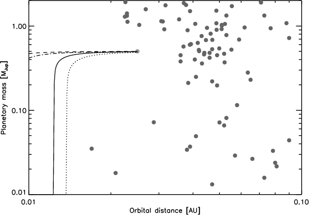 0.015 AU, low density hot gas giants in orbits around solar type stars may even evaporate down to their coresize, while low density Neptune-class objects can lose their hydrogen envelopes at orbital distances