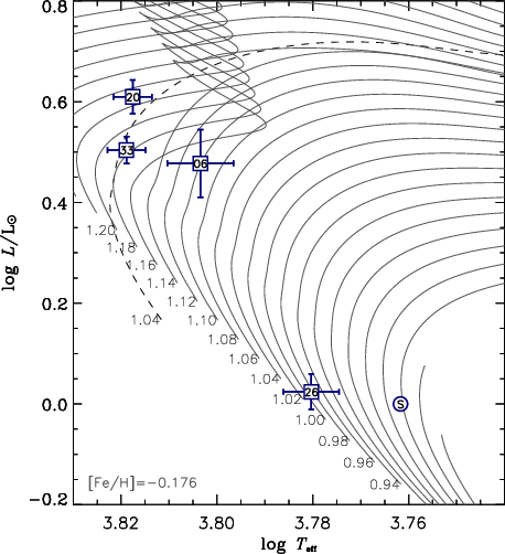The positions of the four CoRoT targets are shown in the Hertzsprung-Russell (H-R) diagram in Fig. 2, where ASTEC evolution tracks from Christensen-Dalsgaard (2008) are overlaid. The position of the Sun is shown for reference. The mass and radius of a single field star can be estimated by comparing its properties to such theoretical evolution tracks.