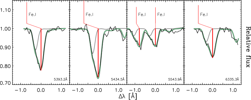A small section of the observed spectra is shown in Fig. 1 and the general properties of the spectra are listed in Table 1. The S/N was measured in the continuum as the average of several regions in the range 5500-6500 Å. We calculated the S/N for the original resolution and for a degraded resolution of R=42 000 (S/N42 in Table 1), with two pixels per resolution element.