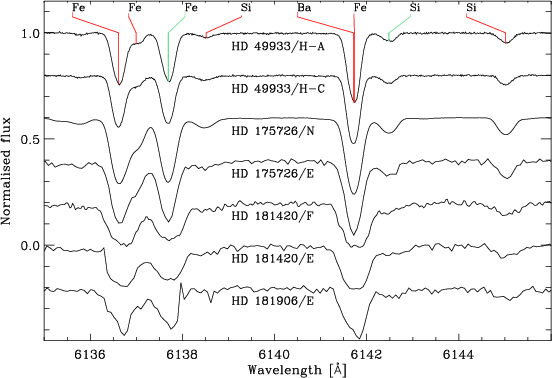Spectra of HD 175726, HD 181420 and HD 181906 were obtained from the GAUDI database (Solano et al. 2005). These spectra were collected as preparation for the CoRoT mission with the ELODIE spectrograph mounted on the 1.93-m telescope at the Haute-Provence observatory. The typical S/N in these spectra is 120. Additional spectra of HD 175726 were obtained with the NARVAL spectrograph on the 2 m Bernard Lyot Telescope at the Pic du Midi observatory as part of the CoRoT follow-up program. We stacked 13 spectra to get a S/N of 900. A spectrum of HD 181420 was also obtained with the FEROS spectrograph at ESO.