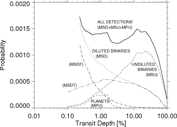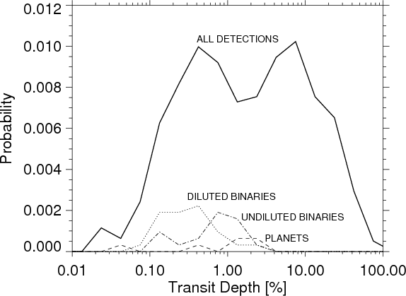 Figure 2: Probability of occurrence of the classes of false positives (diluted and undiluted binaries) and of confirmed planets detected by CoRoT, per unit log of transit depth, based on the amplitude found in the original CoRoT light-curve. The classifications based on observational follow-up have been multiplied by 2.5; see text. The upmost line indicates the distribution of all candidates found by the detection program, identical to Fig. 1. |