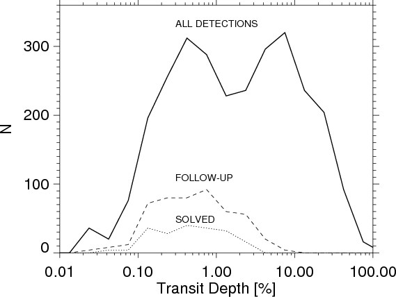 Figure 1: Number of candidates found by the detection program, candidates in the observational follow-up program and candidates with solved follow-up observations. Candidate numbers are given in bins of a width of 0.25 log (transit depth); chosen in order to make this graph appear similar to Figs. 2 and 3. |