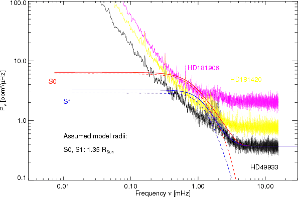 There is mounting theoretical and observational evidence (Cattaneo 1999; Trujillo Bueno et al. 2004; Vögler & Schüssler 2007) that dynamo action is possible in convective surface flows generating magnetic fields on very small scales. To investigate whether such magnetic fields can explain the puzzling shape of the spectrum around 1 mHz in HD 49933, we performed exploratory MHD simulations with CO5BOLD (Steffen et al. 2009). They were restricted to two spatial dimensions, and performed for solar atmospheric conditions. We calculated several runs with different, prescribed magnetic flux levels corresponding to field-free to weak plage regions. Figure 5 shows temporal power spectra of the light curves of the simulation runs (not scaled to full disk). Despite that the simulations were tailored to solar conditions, we think that the very similar topology of granular flows among solar-type stars makes them qualitatively also applicable to HD 49933. The power spectra of the light-curves show a trend towards lower power at higher frequencies for increasing total magnetic flux. Obviously, small scale magnetic fields alter the convective dynamics on small spatial scales but do not lead to the formation of structures on large scales which may leave an imprint at lower frequencies in the brightness fluctuations. The results are preliminary, and further work is necessary. However, for the time being we consider it unlikely that local dynamo action in the granular flow - if at all present - can explain the shape of the power spectrum of HD 49933 in the p-mode frequency region.