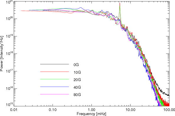 Figure 5: Temporal power spectra of the horizontally averaged emergent intensity in vertical direction of different 2D MHD runs assuming different levels of initial field strength (solid lines of different colors/shades of grey). The simulations were performed assuming solar atmospheric parameters. |