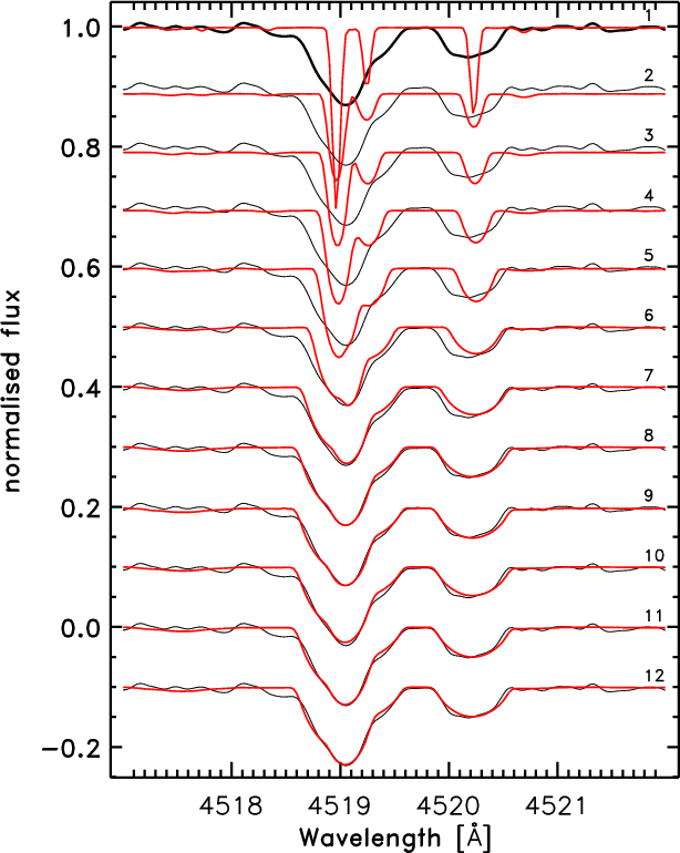 The theoretical spectrum was fitted to the normalised observed one and the continuum was objectively drawn by connecting the highest points of the analysed spectrum part. As an example of the spectral synthesis method, we show in Fig. 3 a comparison between theoretical and observed spectra for the first 12 iteration steps of an illustrative spectral range of HD 46886. In Fig. 4, variations in