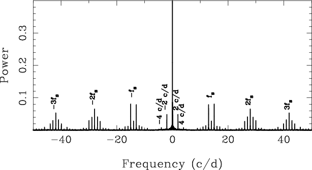 cd-1), and their power levels are much lower than those usual for ground-based data. The alias peak at about 2 cd-1 comes from the South Atlantic Anomaly (SAA) crossing, which occurred twice each sidereal day. This means the alias peaks at 2.005 and 4.011 cd-1, respectively.
