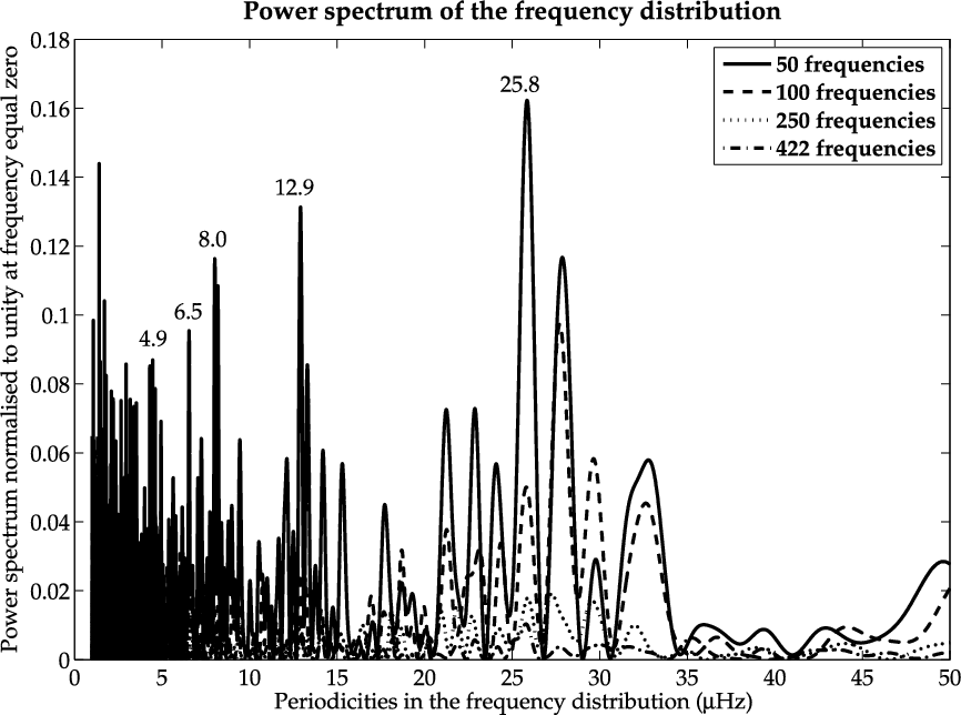 Power spectrum for various subsets of frequencies, selected by amplitude. The solid line represents the power spectrum when the highest 50 frequencies are selected; the dashed line corresponds to the highest 100 frequencies; the dotted line, for 200; and dot-dashed line for all of them. The peak corresponding to the large separation (25.8