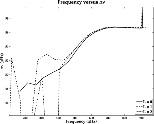 separation calculated this way is depicted. It is quite evident that the large separation does not vary much but is bounded within a frequency range of 10