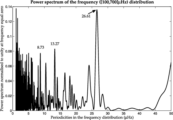 Power spectrum of the oscillation frequencies of a model obtained using the technique described in Sect. 3. We use only the range of observed data set, i.e., up to 700