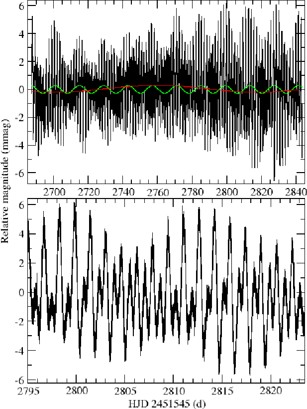 Figure 1: Full 156-day ( top) and zoom ( bottom) of the CoRoT light curve of HD 181231, detrended with a linear fit. On the top panel two sine fits are overimposed, which correspond to a variation with 116.5 and 14.1 days. |