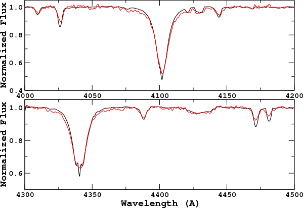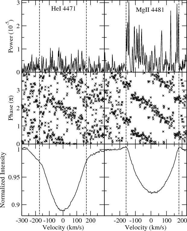 In Fig. 2, we compare the 2006 data (black) of F06 with the average of the new time series data (red) that we convolved with a Gaussian profile to achieve a comparable, lower resolution. Differences between the 2 sets of spectra can be seen in some spectral lines (He I 4026 and 4471, Mg II 4481), due to emission and possibly to pulsations, while the hydrogen lines seem to be slightly broader in the 2006 spectrum.