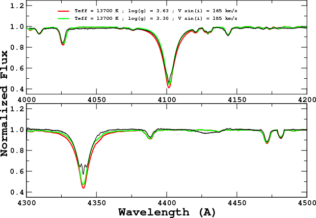 are derived from the average FEROS spectrum using the procedure described in F06. We assume a solar metallicity. Our main fitting criteria are the neutral helium lines and the wings of the