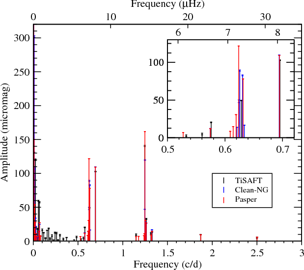 Many combinations of frequencies are also detected as significant peaks in the Fourier analysis of the CoRoT light curve, in particular those resulting from the difference between f2 and f1 or the other peaks in the group around f1. Frequencies detected close to high amplitude peaks could also be caused by changes in the amplitude or phase of the main frequencies.