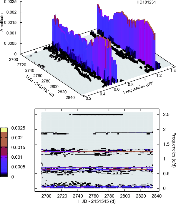 HD 181231 was observed by CoRoT during its LRC1 long run. The observations lasted 156.64 days from May 11 to October 15, 2007, and were uninterrupted. The CoRoT light curve (Fig. 1) was detrended with a linear fit to remove the linear effect of ageing of some instrument parts (CCDs and/or optics). The light curve shows variations with a maximum peak-to-peak amplitude of 11 millimag (see top panel of Fig. 1) and a peak-to-peak point scatter due to noise of less than 0.8 millimag. The noise level of the CoRoT data for HD 181231 is about 3 ppm in 5 days, i.e., very close to the photon noise of 2 ppm. The difference is caused by a jitter correction residue.
