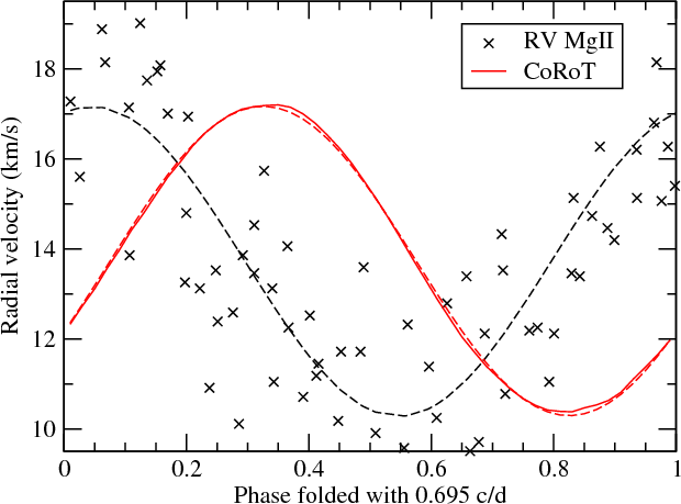 Fig. 9. The frequency of this signal (f=0.00848 c d-1, i.e., 0.098 Hz) is detected in the analysis of the CoRoT light curve and corresponds to the difference between