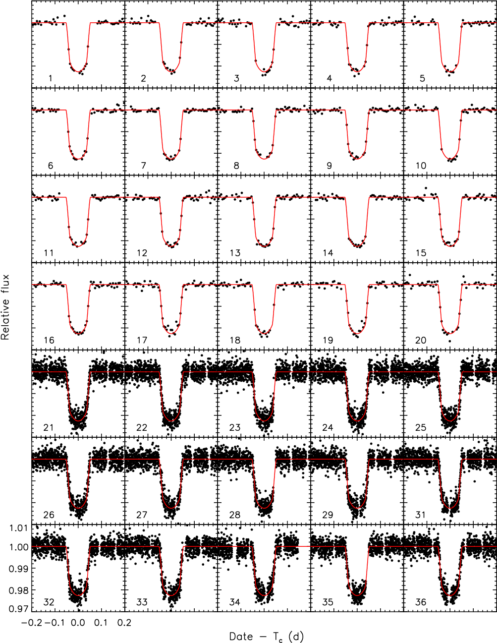 Figure 1: Individual normalized transit light curves for CoRoT-1b (points) with the best-fit model (lines). The number in each panel indicates which transit event is plotted. |
