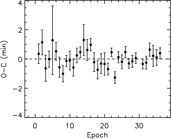 To search for TTVs, I fit the determined transit times with a model assuming a constant period and examined the residuals. The obtained mean transit time and period are given in Table 3. The residuals from the fit are plotted in Fig. 2. The rms of the residuals is 37 s and the maximum deviation is 78 s. The