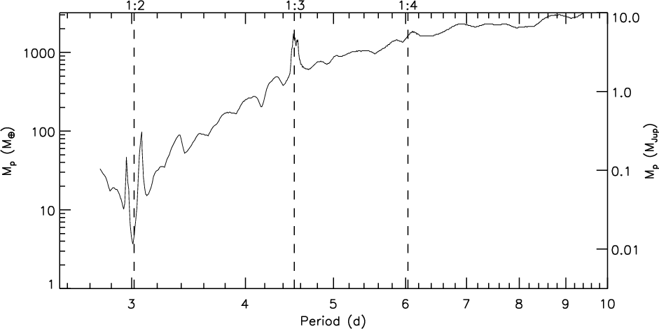 are ruled out for all orbital periods less than about 4.2 d. Planets with masses of 10