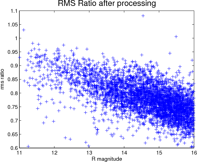 Figure 2: The ratio between the RMS before and after our algorithm (MagZeP and exposure-outlier removal and SysRem) was applied. The figure presents 3893 stars observed by the E2 CCD in the first block of LRa01, with 1693 exposures. |