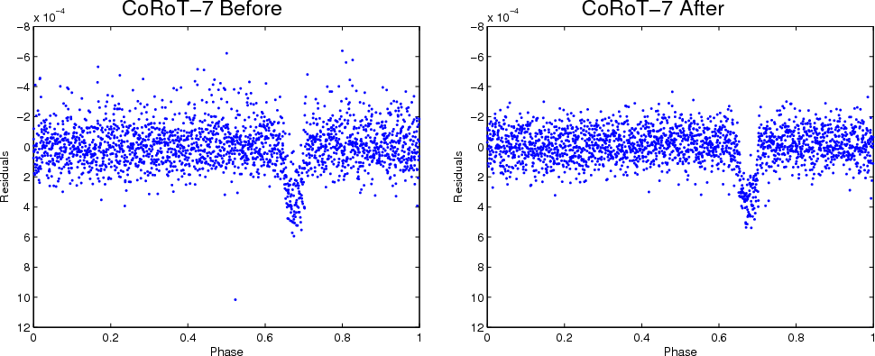 Figure 3: The folded and binned light curve of CoRoT-7, before and after our analysis. |