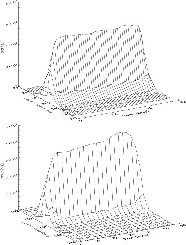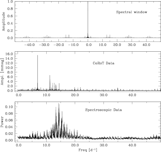 Figure 1: Top panel: the spectral window of the CoRoT data on HD 50844, observed in the Initial Run of the mission. Middle panel: the amplitude spectrum of the original CoRoT data. Bottom panel: the power spectrum (in units of the normalized spectral power) of the line profile variations detected in the ground-based spectroscopic data. |