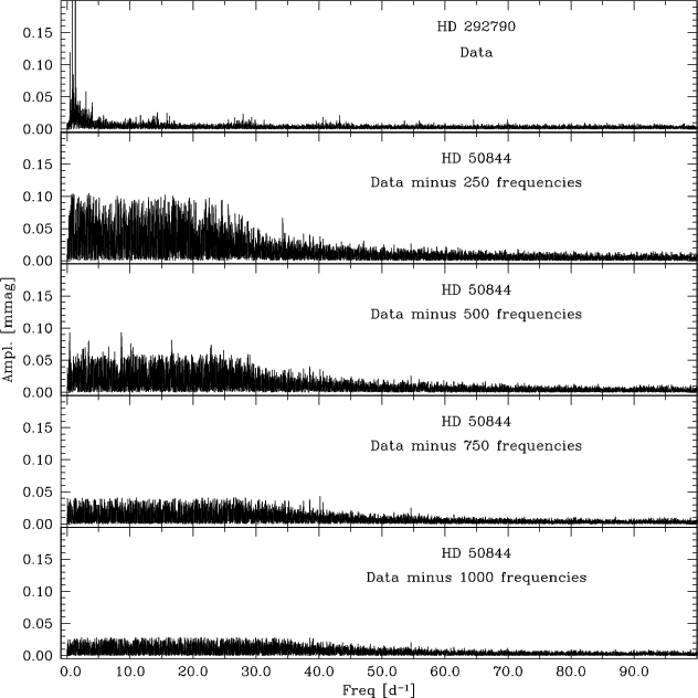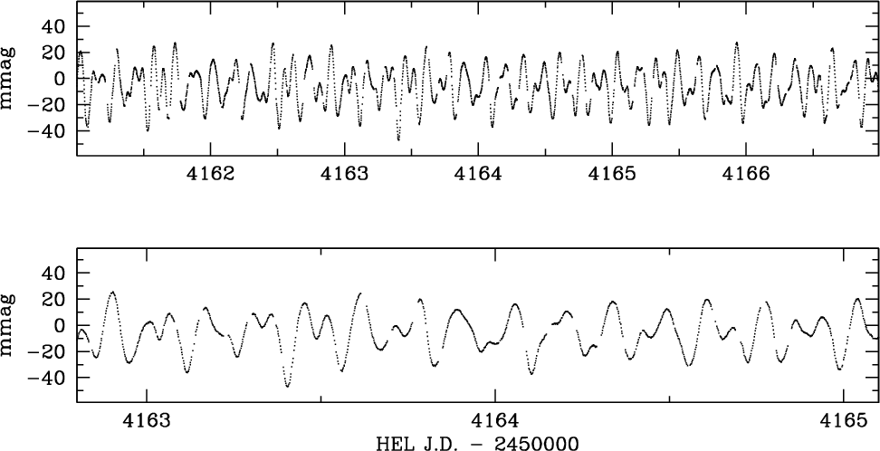 Figure 2: Examples of the light curve of HD 50844 observed by CoRoT. The lower panel is a zoom-in of a region of the upper panel. |