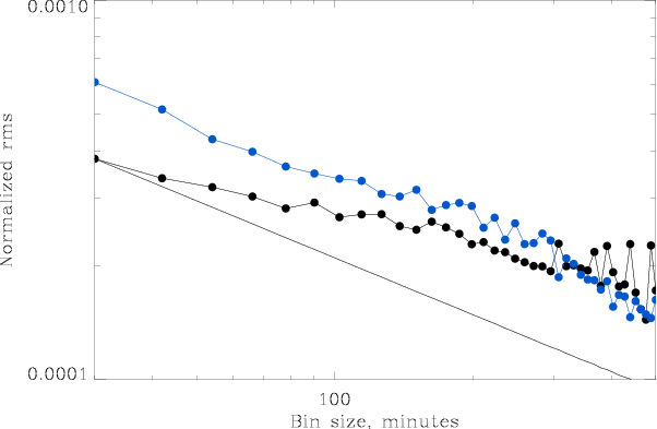 Figure 2: The standard deviation of the light curve after removing a median filtered version with a 12-h window, and after combining it in bins of different sizes. Black dots are for the 32-s part of the light curve, and blue dots for the 512-s part. The solid line follows the theoretical diminution of the dispersion from the 30 min point in the 32-s part, if the noise were white. |