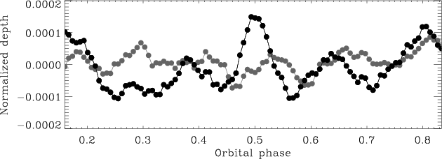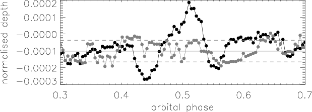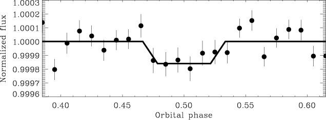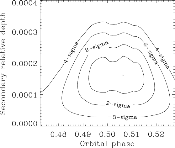 Figure 9 shows the eclipse depth as a function of orbital phase at the best duration. The best-fit depth is 0.019%, consistent with the results presented above. One should bear in mind when comparing the different results that the eclipse depth was measured here relative to the overall median flux rather than to a local estimate of the out-of-eclipse flux.