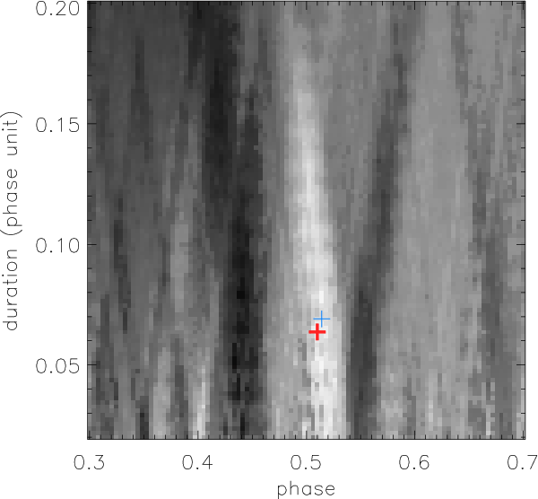 Figure 8: Detection significance map. The red thick cross is the secondary eclipse duration and phase with the largest detection significance. The blue thin cross is the largest detection significance for a secondary eclipse of the same duration as the primary transit. |