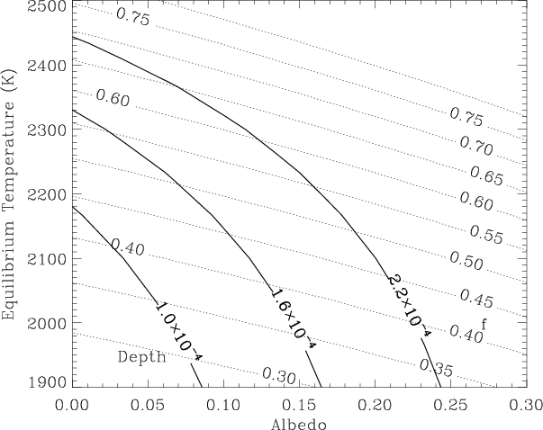 Figure 10: The implied equilibrium temperatures from the secondary eclipse measurement, as a function of the amount of reflected light. The best fitted depth and the one sigma limits are plotted as the solid lines. Different values of the re-distribution factors as defined by Eq. (1) are plotted as dotted lines. Zero albedo solutions imply high values of the re-distribution factor. |