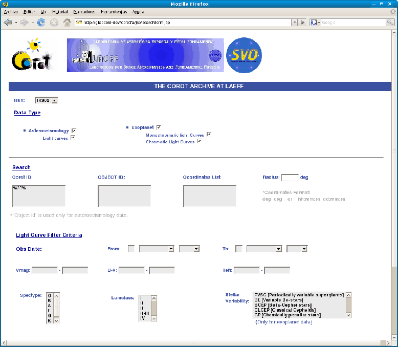 Figure 7: The CoRoT Public Archive at LAEX. Input query form. |