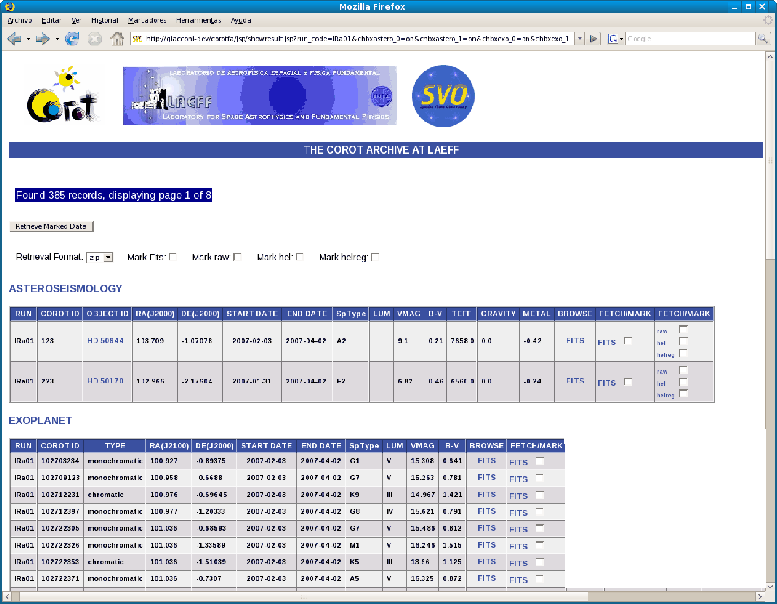 Figure 8: The CoRoT Public Archive at LAEX. Output of a query. |