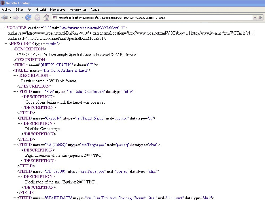 The CoRoT Public Archive at LAEX was designed following the IVOA standards and requirements. In particular, it implements the SSA (Simple Spectral Access) protocol and its associated data model, a standard defined for retrieving 1-D data. Through the CoRoT VO service, a client searches for available data that match certain client-specified criteria using a HTTP GET request. The response is a table (in VOTable format) describing the available data, including metadata and access references (implemented as URLs) for retrieving them (Fig. 11).