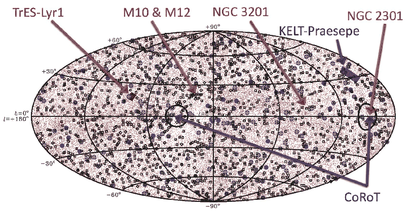 NStED's exoplanet and transit survey service (von Braun et al. 2009) currently contains time-series data (light curves) of all monitored stars in four variability surveys of the stellar clusters M10, M12, NGC 2301, and NGC 3201 (Howell et al. 2005; von Braun & Mateo 2002; von Braun et al. 2002), and two wide-field exoplanet transit surveys (TrES-Lyr1: O'Donovan et al. 2006; and KELT-Praesepe: Pepper et al. 2007; Pepper et al. 2008). Figure 3 shows the locations of these data sets in an Aitoff projection of the celestial sphere.