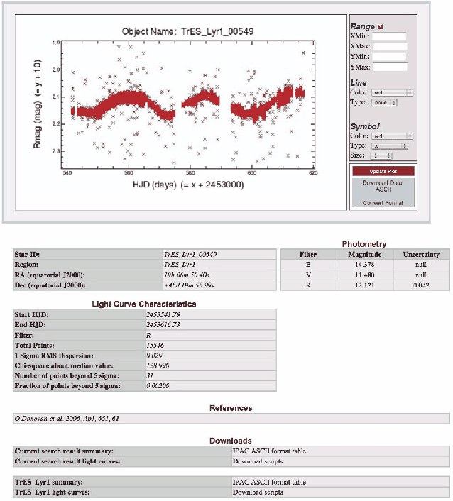Figure 4 shows an example of data visualization found on the NStED-ETSS website, complete with light curve characteristics, data set reference, and links to the associated files and download scripts. The data in this plot are taken from the TrES-Lyr1 data set (O'Donovan et al. 2006). Finally, data sets to be ingested in the near future include XO-1 (McCullough et al. 2006) and WASP0 (Kane et al. 2004).