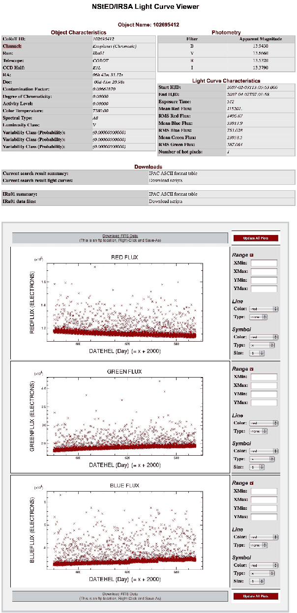 Figure 6: Example of NStED visualizer page of an individual CoRoT star in the exoplanet field. Header information is given at the top, along with links to download options. The customizable visualizer shows the CoRoT time-series data in the three individual CoRoT colors. A similar page is available for asteroseismology targets. |