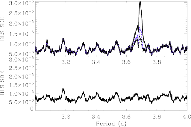 Signal detection efficiency (SDE) of a search for additional planets in the CoRoT light curve in the period range between 3 and 4 days: bottom: result of the search in the original CoRoT light curve; top: same light curve with an additional simulated transiting planet at P=3.69 day with 1.35, 0.95 and 0.6 |