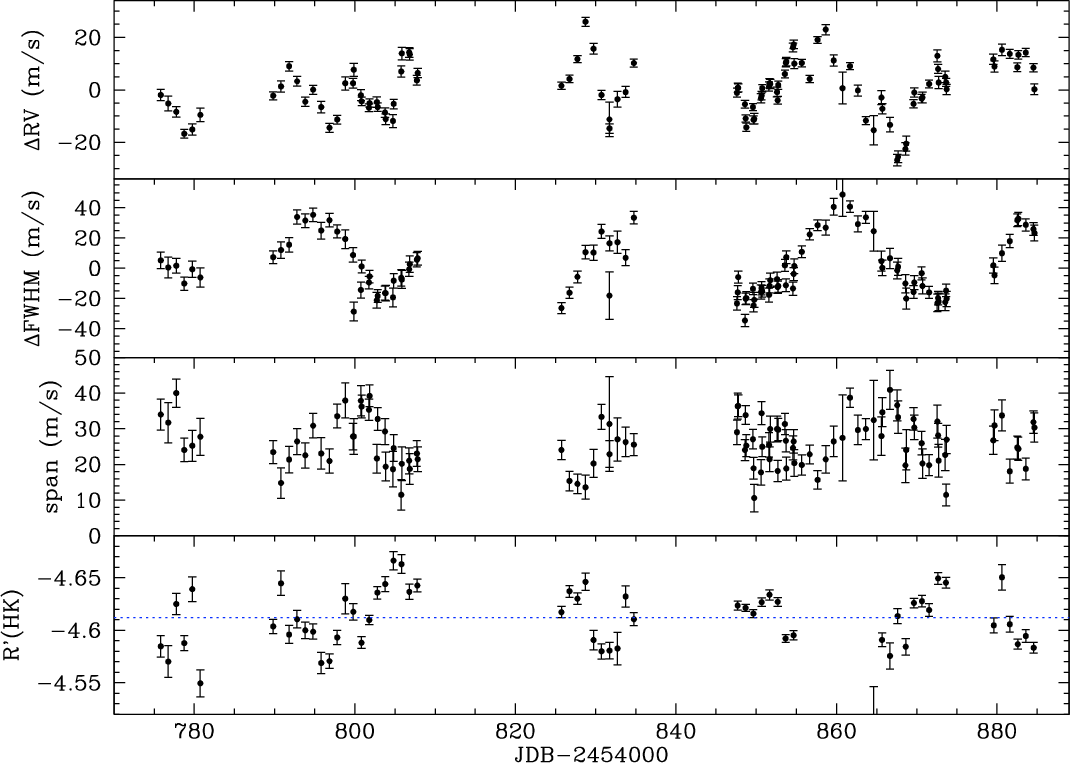Figure 1: A synthetic view of the radial velocity and spectroscopic information measured from HARPS data from November 2008 to February 2009. The dotted line in the bottom diagram indicates the average R'(HK) index. |