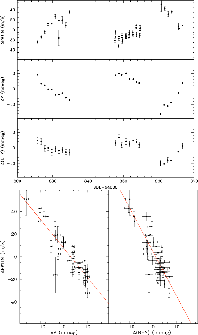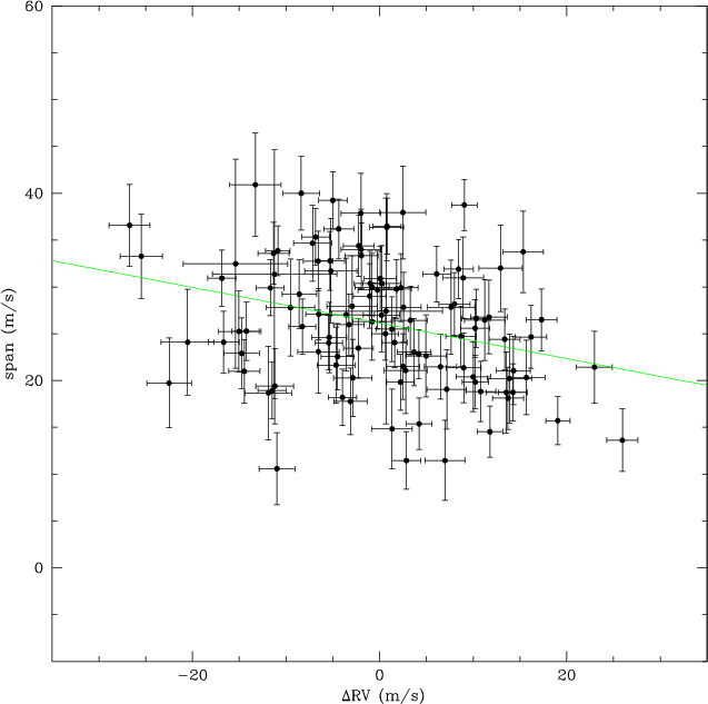 Technically speaking, one uses two simple diagnostics to look for changes in the shape CCF: its width (FWHM) and its bisector span (hereafter bisector) computed according to Queloz et al. (2001). The HARPS
