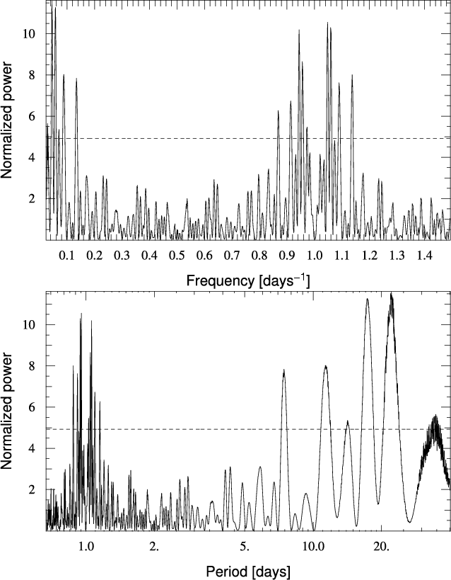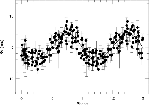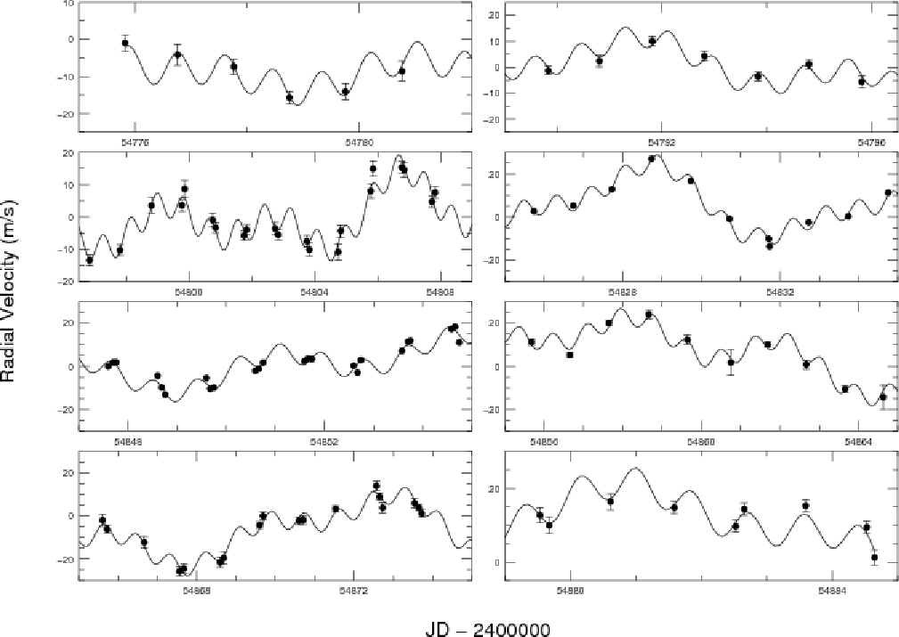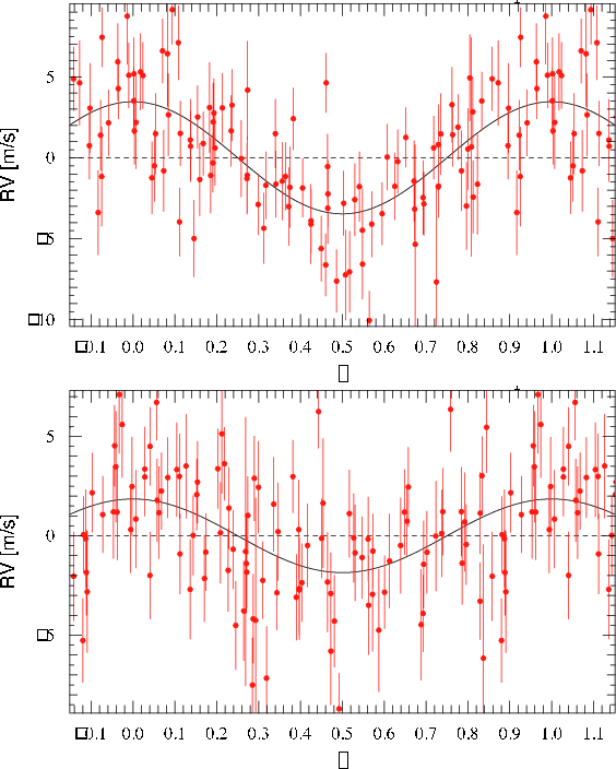 d-1 to both be present in the radial velocity since these are aliases of each other (both ways). However, with the increase in the data sampling, the amplitude of the ``alias peak'' is expected to go away or at least to decrease. We simulated a sine-wave with P = 5.68 with 2 m s-1 white noise, sampled in the same way as the real data, and found that it would have an amplitude 6% higher than its short-period alias (at