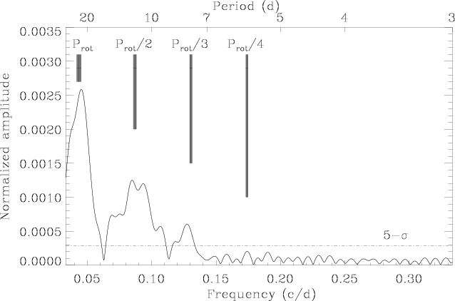First, from the set of observed correlations between the photometry and the spectroscopic activity indicators, any harmonics of the rotation period should be seen both in spectroscopy and in photometry, similarly to the three first harmonics. In the FT of the CoRoT light curve (Fig. 7) no significant peak is detected at