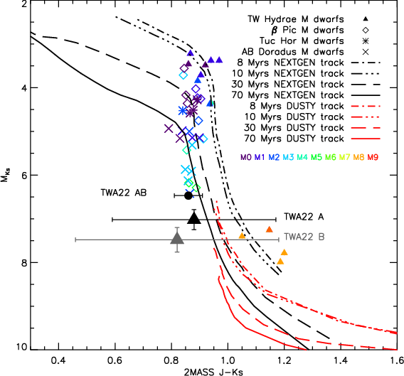 Finally, the projected position of TWA22 AB reveals that the system is isolated from other members of TWA. Its distance is more compatible with the mean distance of the BPMG members. Teixeira et al. (2009) have recently measured the proper motion, the trigonometric parallax, and the mean radial velocity of TWA22 AB. They determined for the first time the heliocentric space motion of TWA22 AB. From a detailed kinematic analysis they did not rule out TWA22 from TW Hydrae but demonstrated that it was a more probable member of the BPMG.