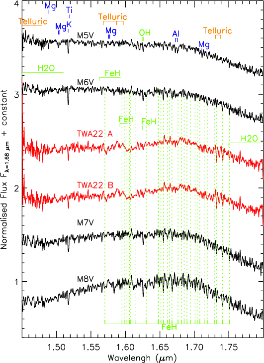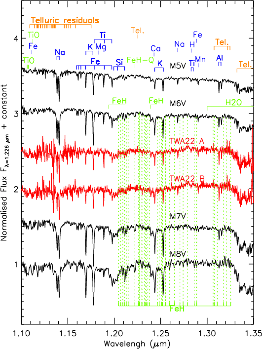 AcknowledgementsWe thank the referee for an excellent and thorough review, which helped to improve our manuscript considerably. We thank the ESO Paranal staff for performing the service mode observations. We also acknowledge partial financial support from the Agence National de la Recherche and the Programmes Nationaux de Plantologie et de Physique Stellaire (PNP & PNPS), in France. We are grateful to Andreas Seifahrt, Laird Close, Eric Nielsen, Catherine L. Slesnick, Nadya Gorlova, Katelyne N. Allers, and Nicolas Lodieu for providing their spectra. This work would have not been possible without the NIRSPEC and UKIRT libraries provided by Ian S. McLean, Michael C. Cushing, and John T. Rayner. We also would like to thank Peter H. Hauschildt, France Allard, and Isabelle Baraffe for their input on evolutionary models and synthetic spectral libraries. Finally, we thank Carlos Torres, Michael Sterzik, and Ben Zuckerman, who gave use precious insights into the discussion.