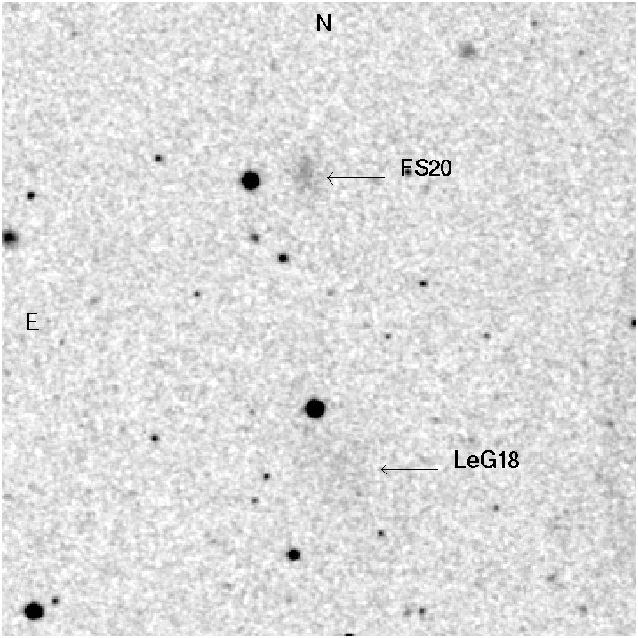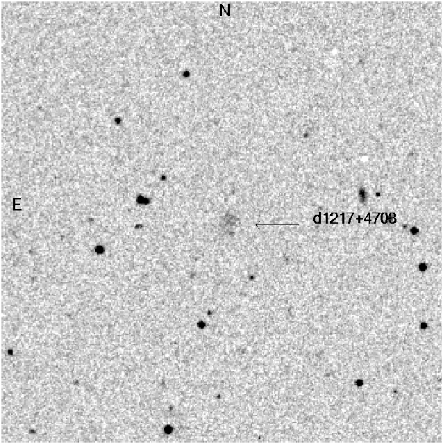 Figure A: 1 b) Reproductions of the blue POSS-II survey measure 6' by 6', north is at top, east at left. The dwarf galaxies FS20 and LeG18 are given in the upper image a), while d1217+4708 is shown in the lower picture b). |